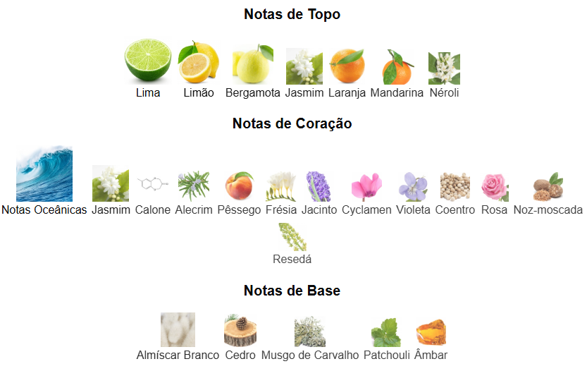 As notas de topo são: Lima, Limão, Bergamota, Jasmim, Laranja, Mandarina e Néroli. As notas de coração são: Notas Oceânicas, Jasmim, Calone, Alecrim, Pêssego, Frésia, Jacinto, Cyclamen, Violeta, Coentro, Rosa, Noz-moscada e Resedá. As notas de fundo são: Almíscar Branco, Cedro, Musgo de Carvalho, Patchouli e Âmbar.