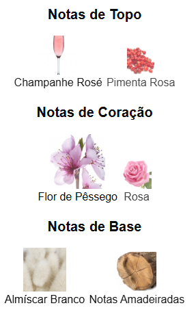 O 212 VIP Rosé Eau de Parfum 80ml traz uma composição fresca e marcante: notas de champagne rosé abrem a fragrância com brilho e ousadia, seguidas por um coração delicado de flor de pêssego, que adiciona feminilidade e charme. Nas notas de fundo, o calor do âmbar e do almíscar branco garante sensualidade e sofisticação.