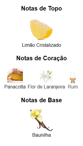 A nota de topo é Limão Cristalizado. As notas de coração são: Panacotta, Flor de Laranjeira e Rum. A nota de fundo é Baunilha.