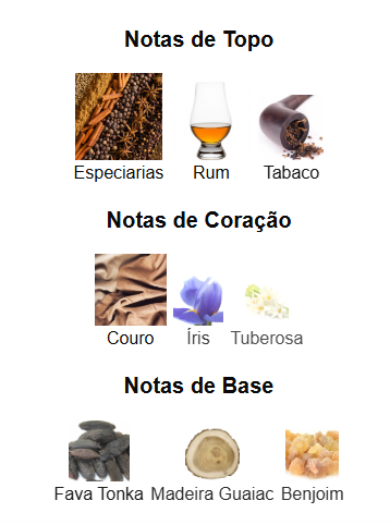Sua composição resulta em fragrância oriental consistente e intensa, perfeita para ser usada em momentos marcantes. Com notas de topo de Rum e Especiarias que se mesclam ao Couro, Tuberosa e Íris, que formam as notas de corpo. O calor e sensualidade da Madeira Guaiac, entrelaça ao Benjoin e Fava Tonka, formando as notas de fundo