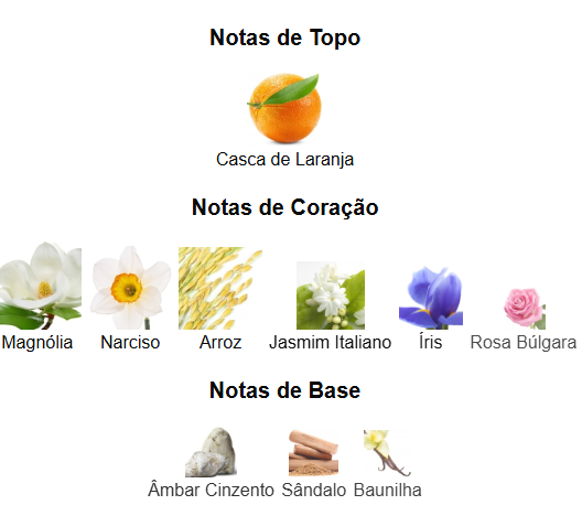 Amor cristalino. Love in White é uma romântica declaração de amor através de um sublime amálgama do aroma da Rosa Búlgara juntamente com a Íris Fiorentina, fazendo com que a mulher que a utiliza seja o centro dessa emissão de paixão. A primeira borrifada é um transporte a uma linda viagem a dois através dos vastos campos de flores da Provença em um dia ensolarado de primavera, onde os recém floreados campos emulam um leve sopro de vento, acariciando o corpo e o ser.