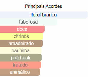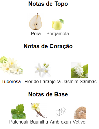 As notas de topo são Pera e Bergamota as notas de coração são Tuberosa, Flor de Laranjeira e Jasmim Sambac as notas de fundo são Patchouli ou Oriza, Baunilha, Ambroxan e Vetiver.
