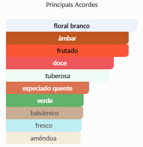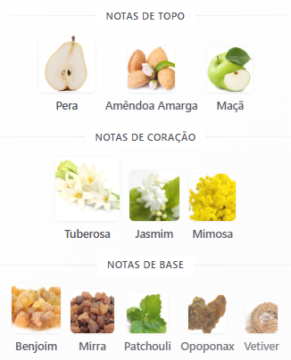• Topo: Pera, maçã e amêndoa amarga – abertura frutada e sofisticada.