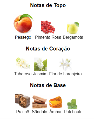 Notas de topo: bergamota, pêssego e pimenta rosa — abertura frutada, fresca e levemente picante.